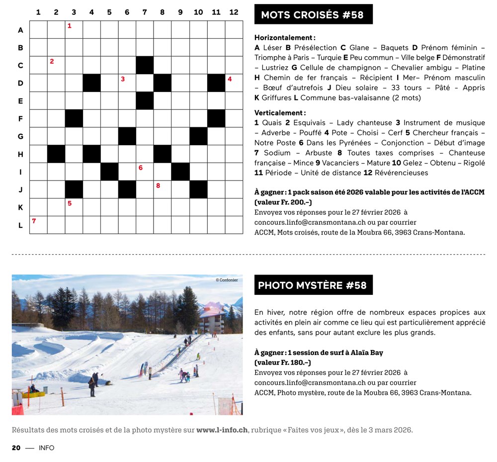 Amusez-vous avec "Le parler à nous", décodez les mots croisés préparés par Jacques Berlie et parcourez notre territoire à la recherche de notre son mystère. Bref, faites vos jeux! Réponses au concours du numéro 58 de l'INFO, ici, dès le 3 mars 2026.